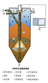流砂过滤器也称为连续反洗砂滤机、连续流砂过滤器、流砂过滤罐、活性砂器。一种集絮凝、澄清、过滤和生物处理功能为一体的连续式运行处理设备。广泛应用于饮用水、工业用水、污水深度处理及中水回用处理领域。采用升流式流动床过滤原理和单一均质滤料,过滤与洗砂同时进行,能够24小时连续自动运行,无需停机反冲洗,巧妙的提砂和洗砂结构代替了传统大功率反冲洗系统。能耗极低,无需维护,管理简便,可无人值守。