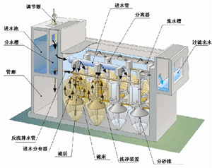 大功率连续流砂过滤设备通常由过滤组件组成并建在水泥池中。过滤组件由不锈钢或碳钢锥形底部和内部构件组成,水泥池和独立式过滤哪一种方式更经济,要根据实际的过滤方案与具体的条件确定。 这种类型过滤器安装时,所有过滤单元(每个单元由多个过滤组件组成)共用一个砂床。一套设备实质上不受过滤面积限制,因此连续流砂过滤系统可以应用在处理相当于100000或更多人口用水的大型水厂和污水处理工厂。